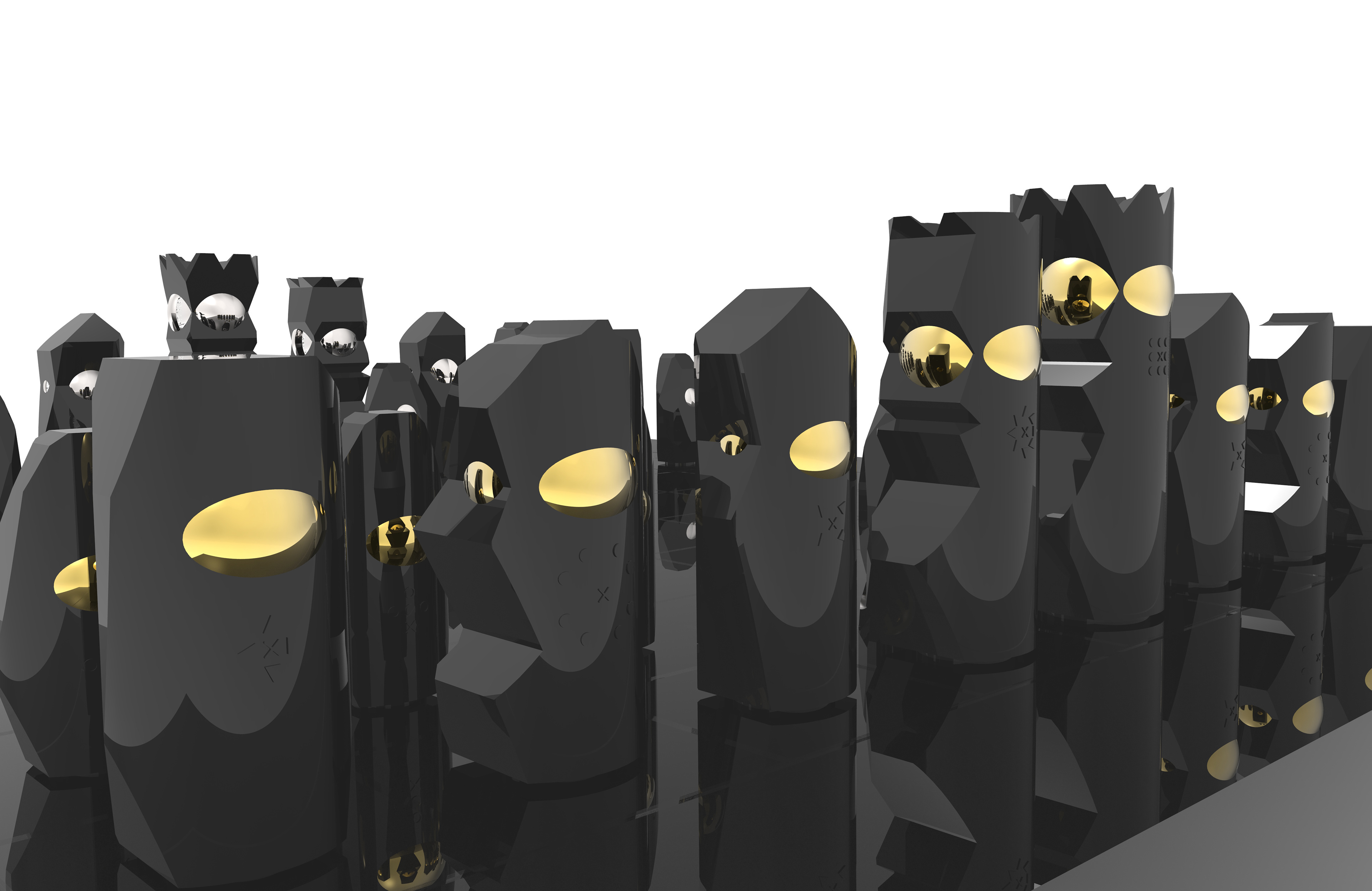 This set took inspiration from low-poly stealth aesthetics, primitive sculpting techniques, and "dazzle" camouflage employed by the Navy to create a game in which that ability to recognize spatial relationships is hindered -- creating intentional confusion for both players.